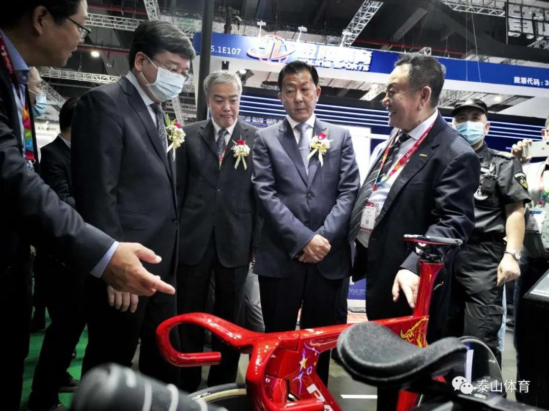 国家体育总局基金会理事长吴齐、山东德州市政协主席翟长生、德州市副市长马俊昀、德州市工信局局长孙洪昌、德州市科技局局长张慧君、乐陵市市长陈光春、乐陵市政协主席刘文学、乐陵市副市长牟正军在milan展厅参观。